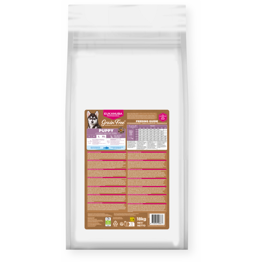 Dette kornfri tørfoder fra EUKANUBA, Grain Free*, er specielt sammensat til hvalpe af store racer i alderen 1 til 18 måneder (eller 1-24 måneder for kæmpestore racer). Dens opskrift med få allergener er rig på havfisk og omhyggeligt designet til hunde med kornfølsomhed, hvilket understøtter deres unikke ernæringsmæssige behov. Den kyllingefrie formel tilbyder et sundt måltid med alternative kulhydratkilder, herunder ærter og glutenfri* søde kartofler, som giver naturlige fibre, essentielle vitaminer og antioxidanter. Det er rigt på havfisk og forsyner også din hvalp med animalske proteiner af høj kvalitet, der er nødvendige for at opbygge og vedligeholde stærke, magre muskler. Det indeholder også DHA for at forbedre indlæringsevnen og calcium til at understøtte knogleudviklingen. Den skræddersyede fiberblanding med kostfibre (FOS), MOS og roepulp fremmer en sund fordøjelse, mens naturlige kilder til omega-6 og omega-3 understøtter en sund hud og skinnende pels. Dette tørfoder giver avanceret ernæring til hvalpe af store racer og understøtter optimal kondition og livslang velvære. Du kan stole på, at EUKANUBA understøtter din hvalps fundament for et lykkeligt og sundt liv.
