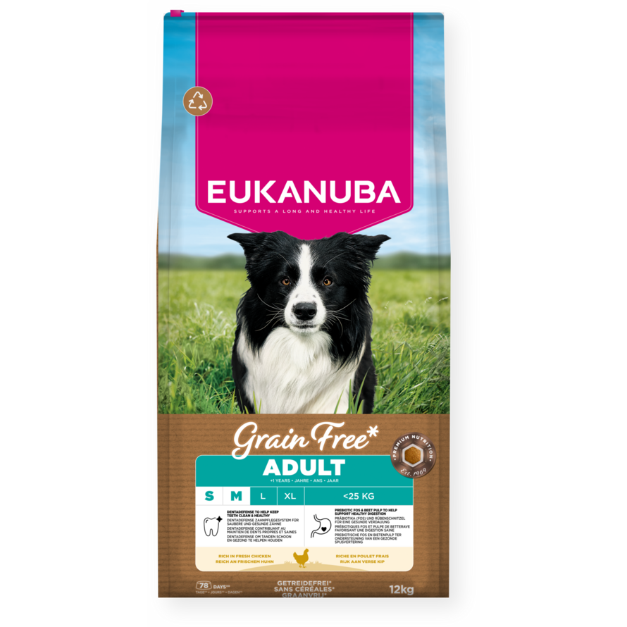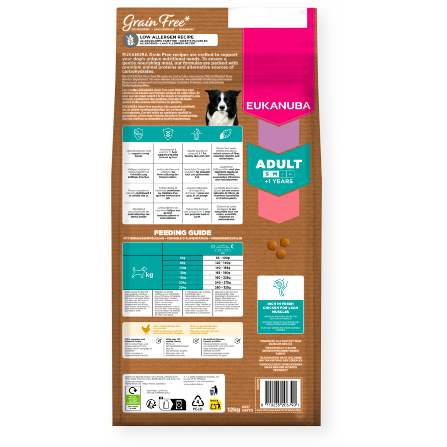 Este alimento seco EUKANUBA Grain Free* está especialmente formulado para perros adultos de razas pequeñas y medianas a partir de 1 año de edad. Su receta, baja en alérgenos y rica en pollo fresco, ha sido cuidadosamente elaborada para perros con sensibilidad a los cereales, apoyando sus necesidades nutricionales únicas. Esta fórmula ofrece una alimentación completa y equilibrada, con fuentes alternativas de carbohidratos, como los guisantes y la batata sin gluten*, que aportan fibra natural, vitaminas esenciales y antioxidantes. Gracias a su contenido en pollo fresco, también proporciona proteínas animales de alta calidad, fundamentales para desarrollar y mantener una musculatura fuerte y magra. Para favorecer una digestión saludable, incluye una mezcla específica de fibras con prebióticos FOS y pulpa de remolacha. Además, la forma exclusiva de nuestras croquetas, junto con el sistema de cuidado dental DentaDefense, ayuda a mantener los dientes limpios y sanos, reduciendo activamente la acumulación de sarro con el tiempo. La fórmula también incluye un nivel de calcio adaptado para fortalecer los huesos, antioxidantes y vitaminas para reforzar el sistema inmunitario, y fuentes naturales de omega-6 y omega-3 que contribuyen a mantener una piel sana y un pelaje brillante. Esta dieta 100 % completa y equilibrada proporciona una nutrición avanzada para perros adultos de razas pequeñas y medianas, ayudando a mantener una condición corporal óptima, una salud duradera y un bienestar general. Confíe en EUKANUBA para ofrecer una nutrición de alta calidad, adaptada a las necesidades dietéticas de su perro.